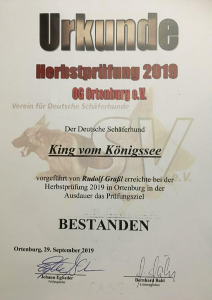 King und Kaya vom Königssee bestehen die Begleithundeprüfung, Herkules vom Königssee erreicht 88 Punkte in der BGH 1.