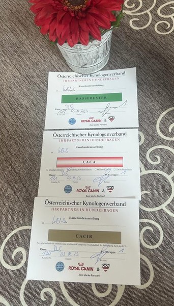 Bei der IHA in Wels wurde Pharos vom Königssee in der Gebrauchshundeklasse mit Vorzüglich 1 bewertet. Er erhielt die Auszeichnungen: Rassebester, CACA und CACIB.