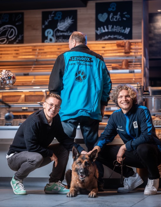 Die Löwen-Spieler Fabian Greilinger und Jesper Verlaat haben der Traditionsbäckerei Brücklmaier (Partner des TSV 1860 München) einen Besuch abgestattet.